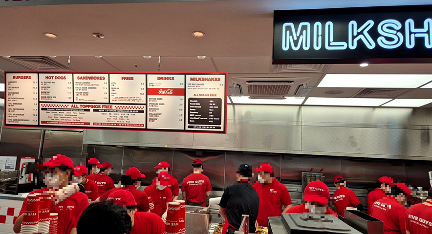 매장은 백화점 1층에 위치해 접근성이 뛰어나다 못해 온통 파이브 가이즈 가는 방향을 안내해줍니다. 그래서 찾아가기도 쉽고 매장밖에서 내부를 바라볼 때 이미 맛집을 인정하는 대기선을 보고 여기가 파이브 가이즈 구나하고 알 수 있습니다.