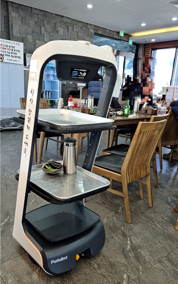 주문후 반찬은 로봇 선생님이 배달 해주신다. 테이블에서 받고 확인을 눌러 주면 다시 사장님곁으로 가서 다음 배달을 수행한다. 똑똑하죠