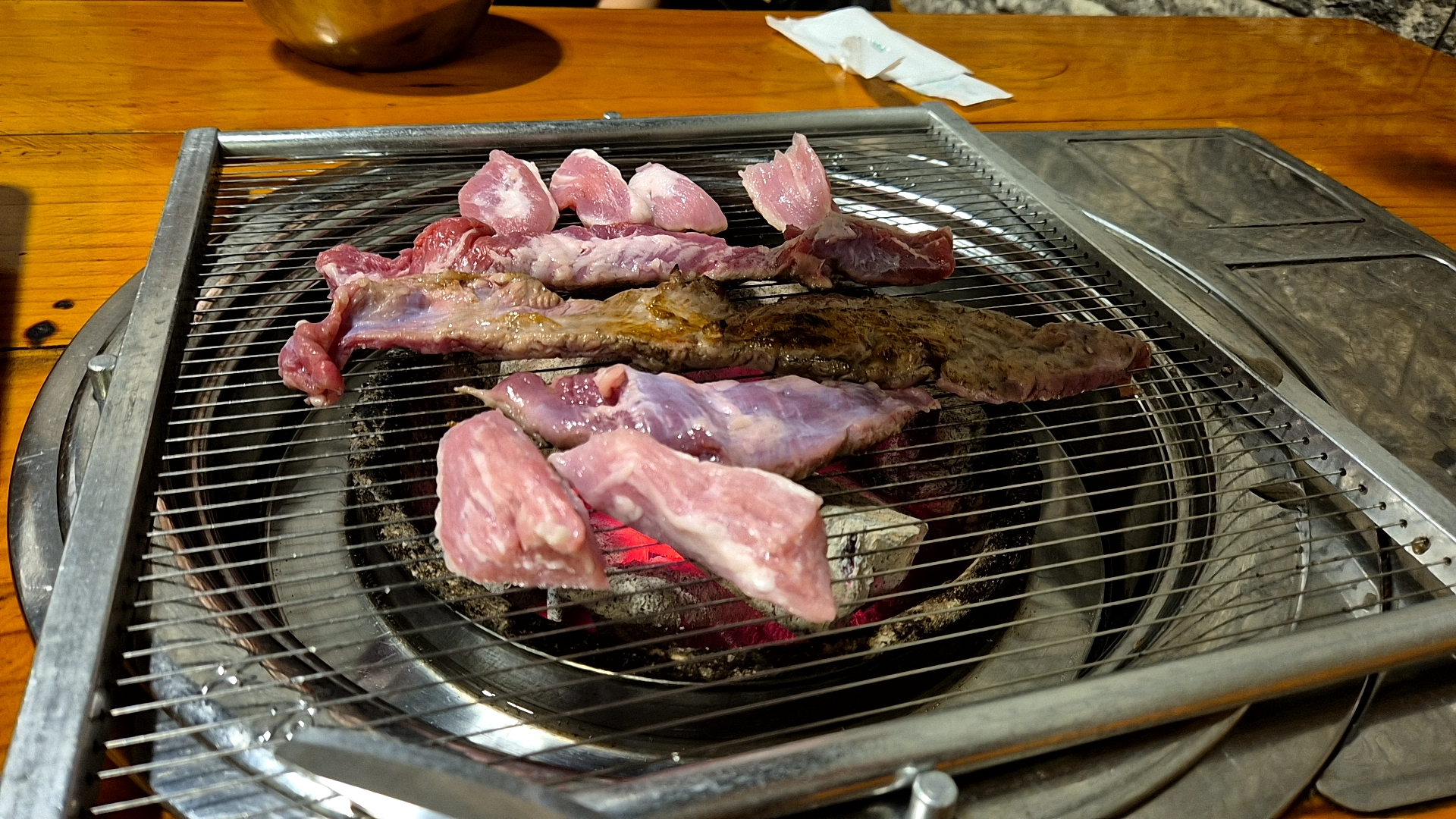 우리가 주문한 메뉴는 갈매기살 & 쫀득살 세트입니다. 이 조합은 기름기가 적당히 배어 있는 갈매기살과 쫄깃한 식감이 매력적인 쫀득살이 함께 나와서 다양한 식감을 한 번에 즐길 수 있습니다.