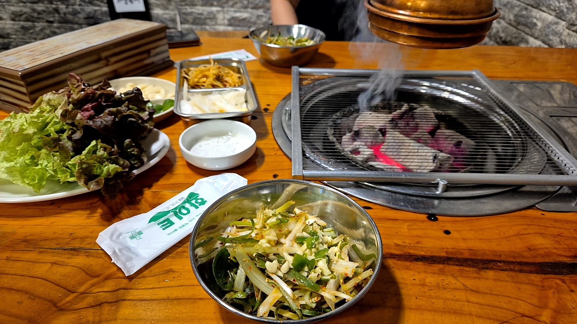 ✔ 세트 구성 세트를 시키면 기본적으로 쌈채소, 파절이, 마늘, 쌈장, 고추까지 푸짐하게 나오는데, 특히 굵게 썰은 파절이에 투박한 마늘 찹 조합이 환상적입니다. 약간은 맵다고 느낄 정도의 마늘찹이 고기의 기름기를 잡아주면서 깔끔한 맛을 더해줘서 입맛을 자극합니다. 넓은 코너를 돌면 셀프바에 이 모든게 마음껏 가져 갈 수 있습니다.은박지 위에 마늘 기름도 만들어 먹을수 있습니다.