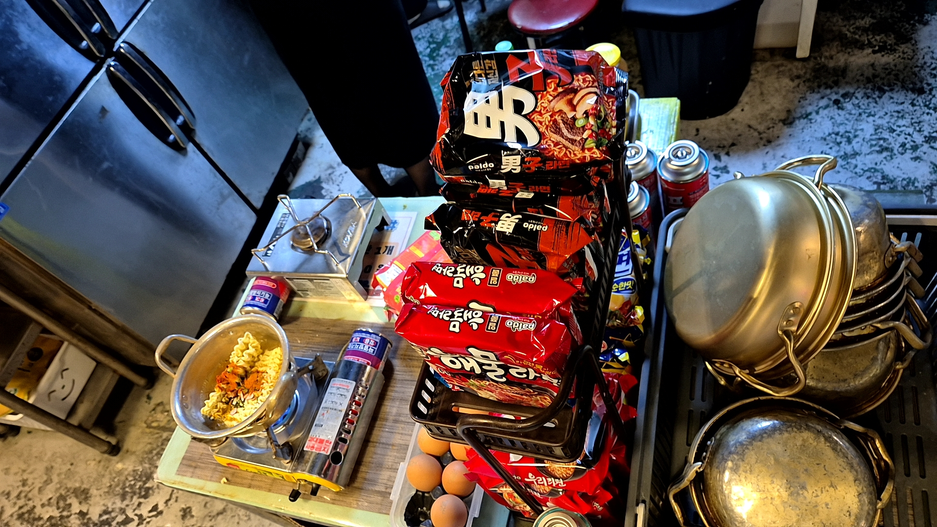 ✔ 라면 조리 과정 라면 코너에 가면 기본적인 재료(라면, 계란, 물)가 준비되어 있어요. 우리는 "라면 1개 + 계란 1개(1,000원)" 세트를 저희는 2개를 끓여 먹었습니다.