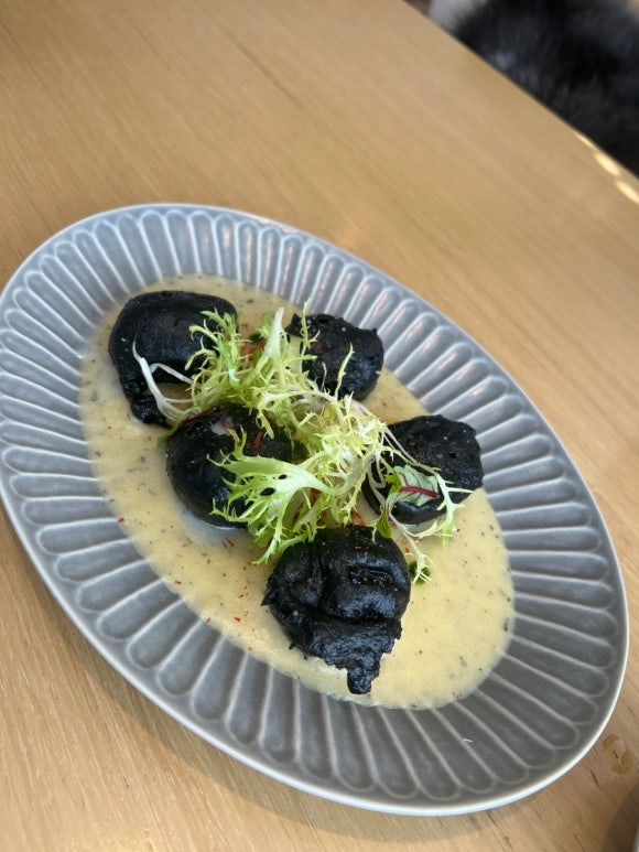 크리스피 먹물 관자와 감자 퓌레