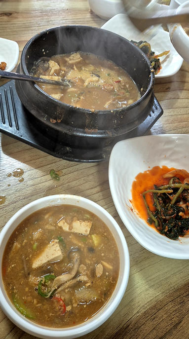 북북신진중장비학원 바로 앞 청국장 집은 둘째 날 방문 했습니다. 진접 구석에 있는 음식점 치고는 가격이 있습니다. 상세 가격을 찍은 게 없는데 시그니처 청국장 보리밥 1인분에 11,000원은 조금 부담스러운 가격 같습니다. 우리 팀원으로 4명이 모두 함께 식사를 하자고 해서 청국장 보리밥으로 주문했는데 하나의 항아리 대접에 4인분이 함께 나왔습니다.