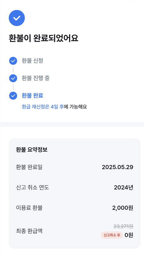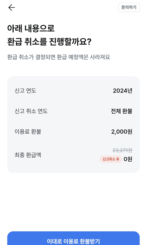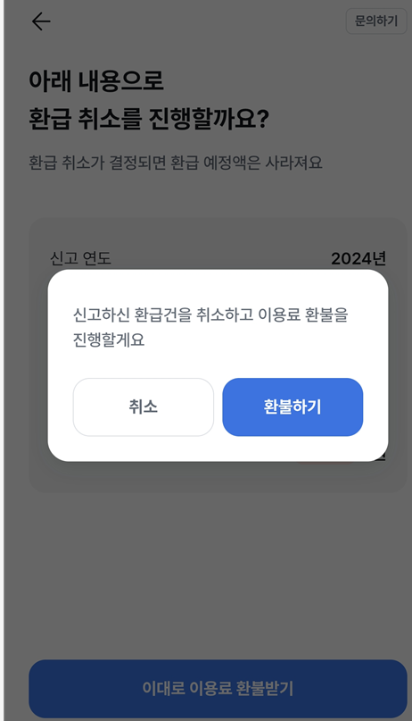 환급 신청과 함께 결제가 완료되었더라도, 환급 취소가 승인되면 카드 결제도 자동 해지됩니다.