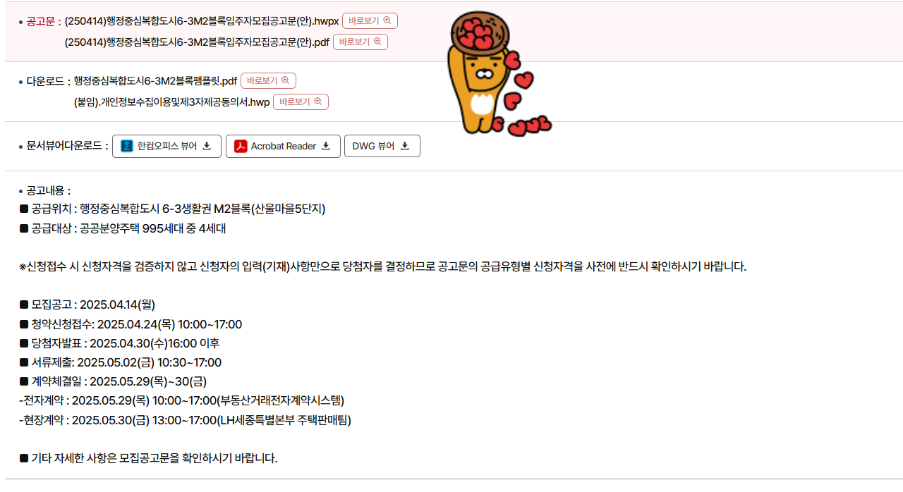 첫번째 행정중심복합도시 6 - 3M2BL 잔여세대 입주자 모집 공고를 클릭 해서 공고문을 잘 읽어 본다.