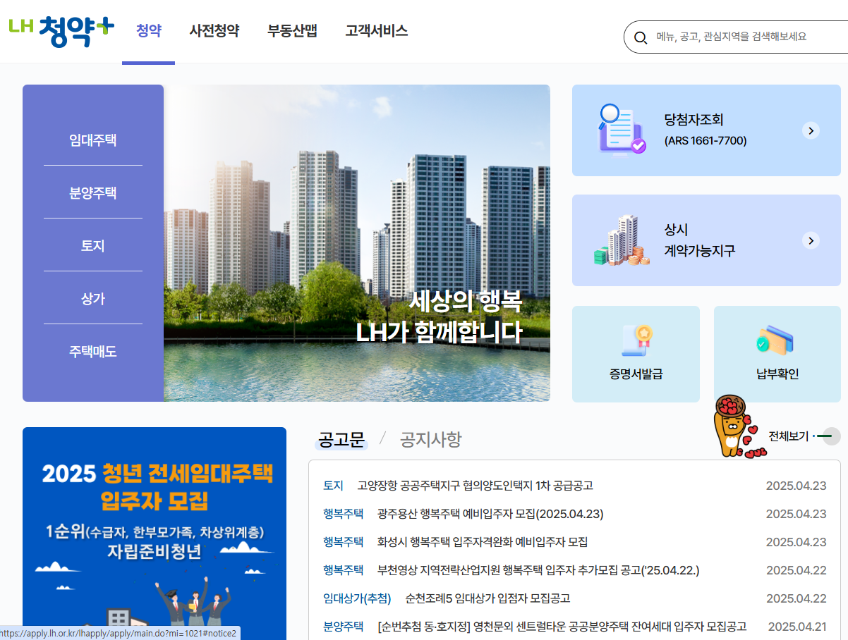 청약 절차 요령은 간단하게 춘식이를 따라가 볼게요 잘 따라오세요 하트를 쏟아붓고 있는 춘식을 클릭 클릭 하시면서 따라가시면 됩니다 그럼 춘식이 따라갈 준비되셨나요?