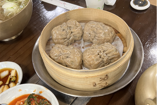 막국수를 주문하면 꼭 함께 먹어야 하는 사이드 메뉴가 있는데 바로 메밀손만두 입니다. 이곳의 만두는 일반 만두와 달리 메밀 피로 만들어져 더욱 쫄깃하고 구수한 맛이 특징입니다. 한입 베어 물면 고소한 메밀향과 함께 속이 꽉 찬 만두소가 입안 가득 퍼집니다. 고기와 채소가 적절히 섞여 있어 담백하면서도 감칠맛이 강하고 특히, 막국수 육수에 살짝 적셔 먹으면 그 감칠맛이 배가 됩니다. 너무 맛있어서 순식간에 사라질 정도로 인기 만점입니다.