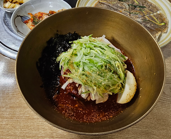 막국수 하면 역시 비빔막국수를 빼놓을 수 없죠! 용암리 막국수의 비빔막국수는 매콤하면서도 새콤달콤한 양념이 특징이에요.일반적인 비빔막국수보다 고소한 메밀향이 더 진하게 살아있고, 고추장 베이스의 양념이 자극적이지 않고 깔끔하게 어우러지는 맛이었어요. 게다가 면이 적당히 쫄깃해서 비벼 먹는 재미까지 있더라고요.