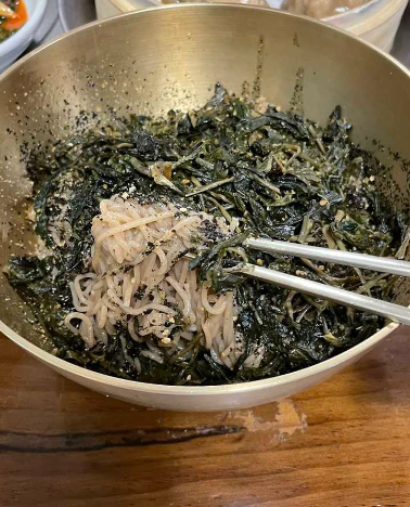 용암리 막국수의 시그니처 메뉴라 할 수 있는 부지갱이 막국수! 처음 들어보는 분들도 많을 텐데요. ‘부지갱이’는 들풀의 한 종류로, 예로부터 강원도 지방에서 막국수와 함께 먹던 전통 재료입니다. 부지갱이는 씹을수록 은은한 향이 퍼지고 막국수 면과 어우러지면 깔끔하면서도 개운한 맛을 더해 줍니다. 막국수의 살짝 거친 메밀면과 부지갱이의 식감이 묘하게 조화를 이루면서 신선한 맛을 선사했습니다.