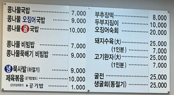 ✅ 저렴한 가격 – 지금은 7천원이지만 아직까진 부담 없는 한 끼 식사로 딱입니다 콩나물 국밥 외에도 다양한 메뉴들이 그리 과하지 않은 가격으로 포진 되어 있고, 수육도 1인분 가격으로도 나와 있어 혼술 하시는 불들도 2만원 이하로 드실수 있는 합리적인 가격입니다.
