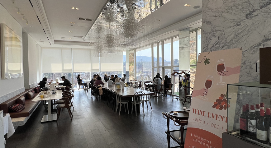 이번 식사에서 또 하나 만족스러웠던 점은 창가 자리에서의 경험이었어요. 바깥으로 보이는 나무와 넓디 넓은 잔디 정원이 어우러져, 마치 여행 온 듯한 기분이 들더라고요. 사실 그냥 정원만 넓디 넓었으면 별로 재미가 없었을 텐데, 우리가 간날 현대자동차에서 전시 행사를 하는 날이라 더 특별해 보이기도 했습니다. 자동차 전시와 카페는 2탄으로 찾아 올께요