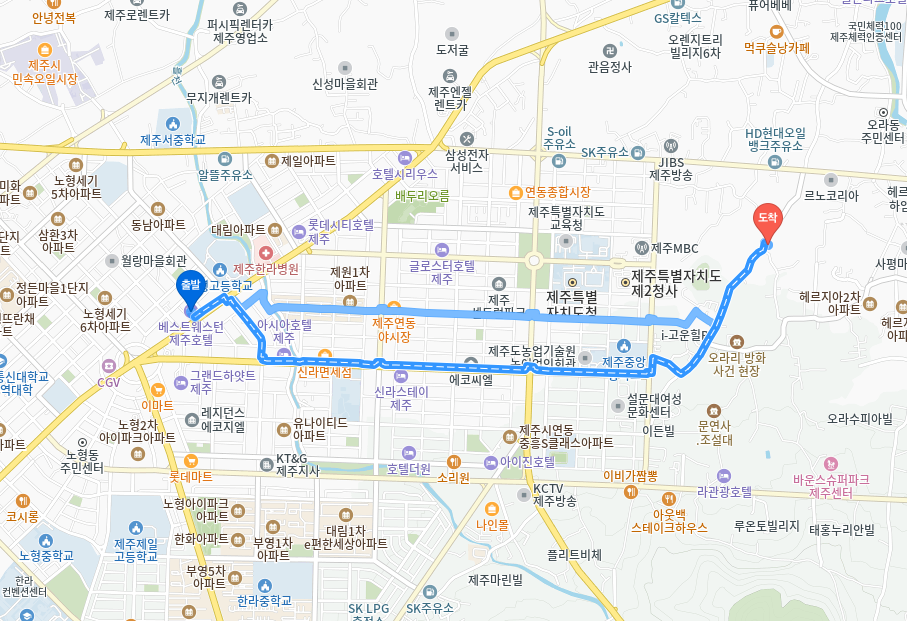 - 다음날 픽업이라 택시를 타고 갈 수도 있었지만, 제주의 날씨를 만끽하기 위해서 혼자 러닝으로 바로 렌터카까지 뛰어서 갔습니다. 거리는 3km 정도 되었고 신호를 지켜가며 갔어야 했기에 30분 정도 걸린 거 같습니다.