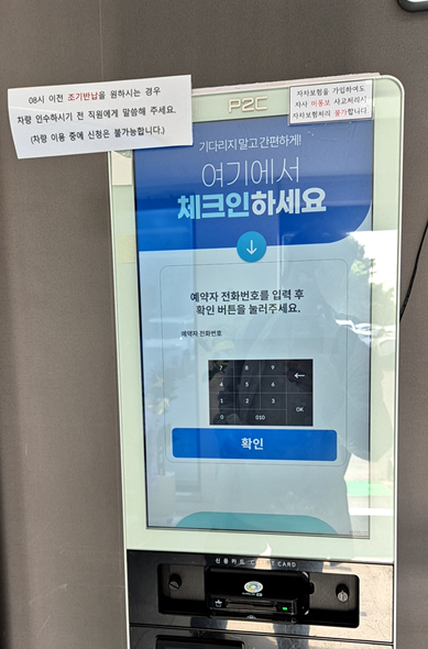 - 사무실 들어가 키오스크 안내에 따라 면허증 스캔 하고 모든 절차를 깔끔히 마무리하면 데스크에서 키를 내어 주십니다.