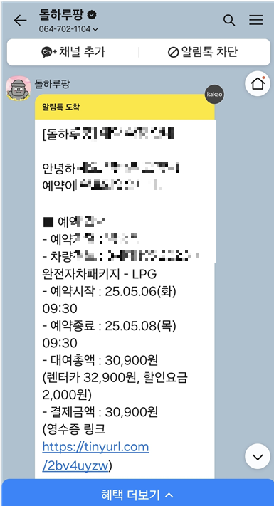 4. 차량 선택 후 운전자 보험과 보험 최종 선택후 결제 하기로 들어 가서 결제하면 해당 렌터카에서 카카오 문자가 옵니다.