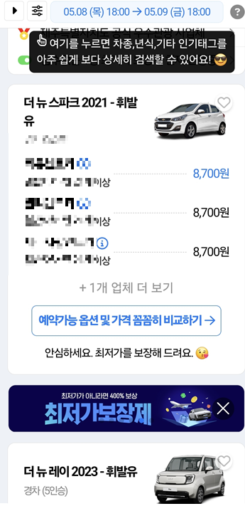 2. 원하는 차종을 선택하면, 다양한 업체의 가격이 자동으로 비교됩니다. 왼쪽 상단 산선을 클릭하면 원하는 차량과 연식 기타 원하는 사항을 선택하면 그에 맞는 차량과 가격 등등 비교한 렌터카가 보입니다.