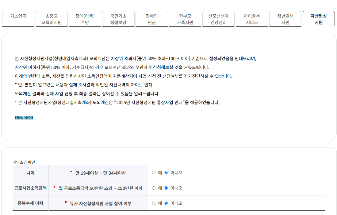| 기초생활수급자 | 만 15~39세, 기준 중위소득 50% 이하, 월 10만 원 이상 근로소득 | 월 10만 원 저축 시 정부 30만 원 매칭 |