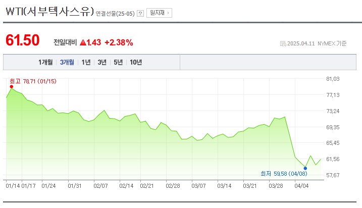 미국 상호 관세 정책 발표 이후 글로벌 경기 둔화에 대한 지속적인 우려와 미국 에너지정보청의 석유 수요 둔화 전망으로 인해 국내 유가의 선행 지표인 국제 유가가 하락했습니다. 국제 유가는 일반적으로 2~3주 후 국내 석유제품 가격에 반영됩니다.