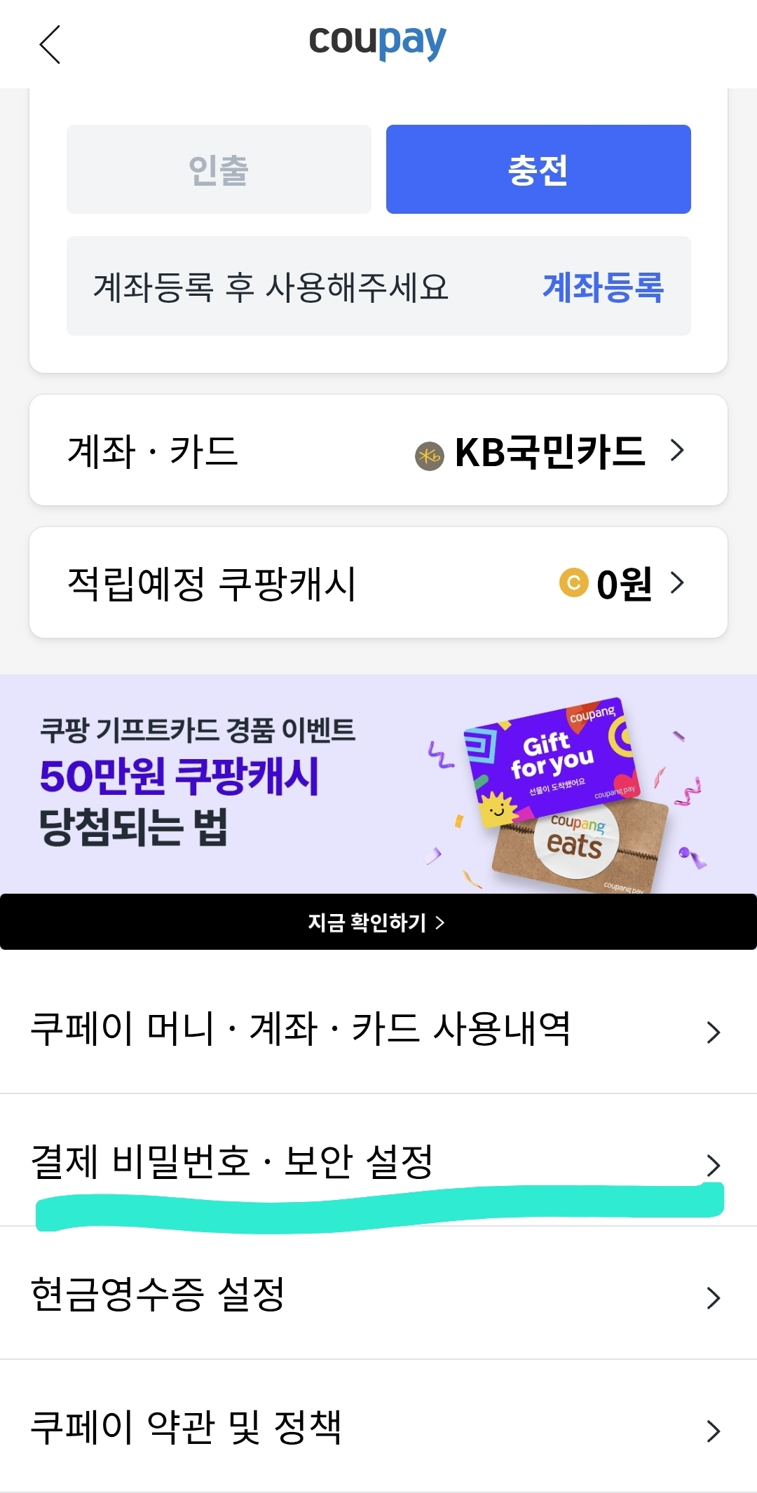 경로: 사람 모양 → 전체 메뉴 → 결제수단 → 결제 비밀번호 보안 설정