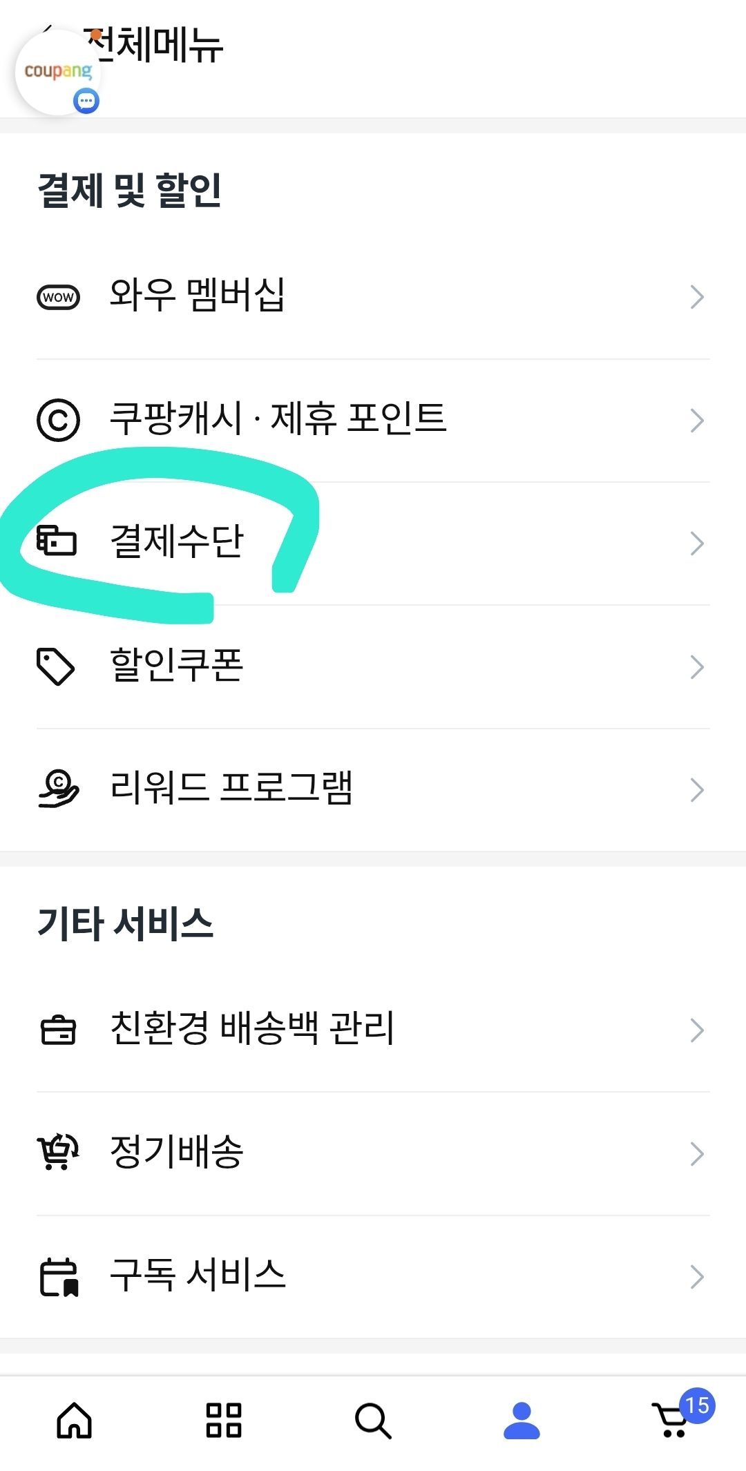 경로: 전체 메뉴 → 결제수단